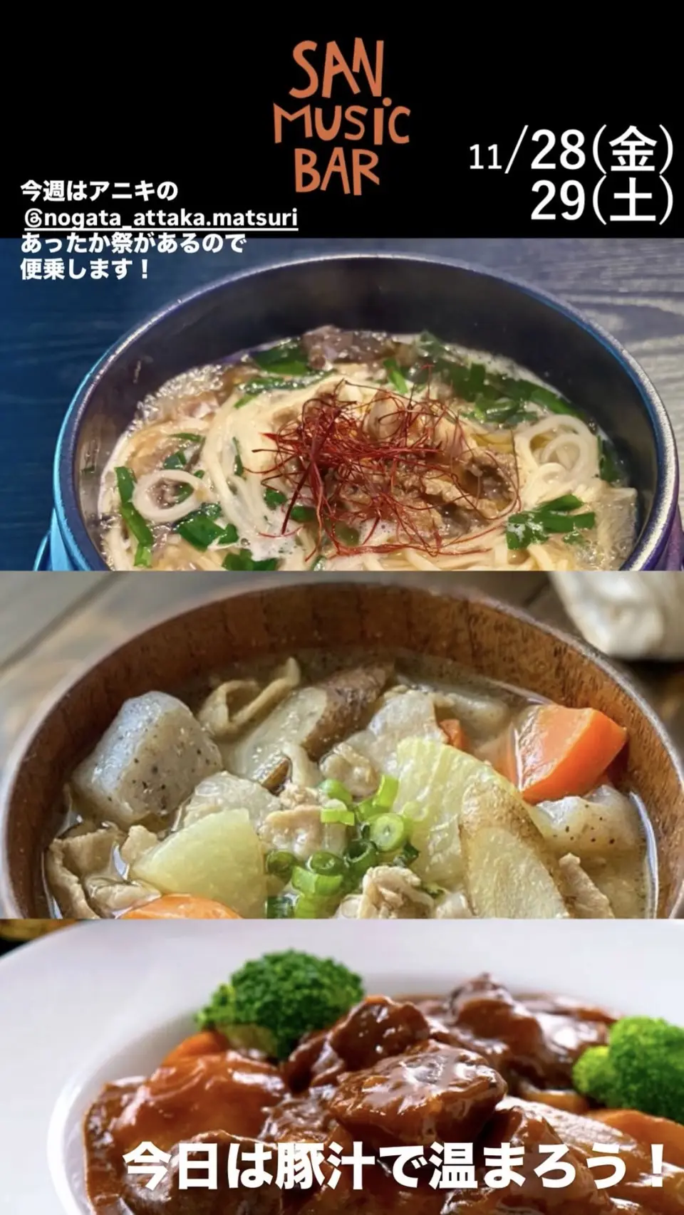| 飲食営業時間 | 月曜 17:00~24:00 予約営業 水曜・木曜 20:00~ SANラーメン 金曜・土曜 14:00~26:00 |