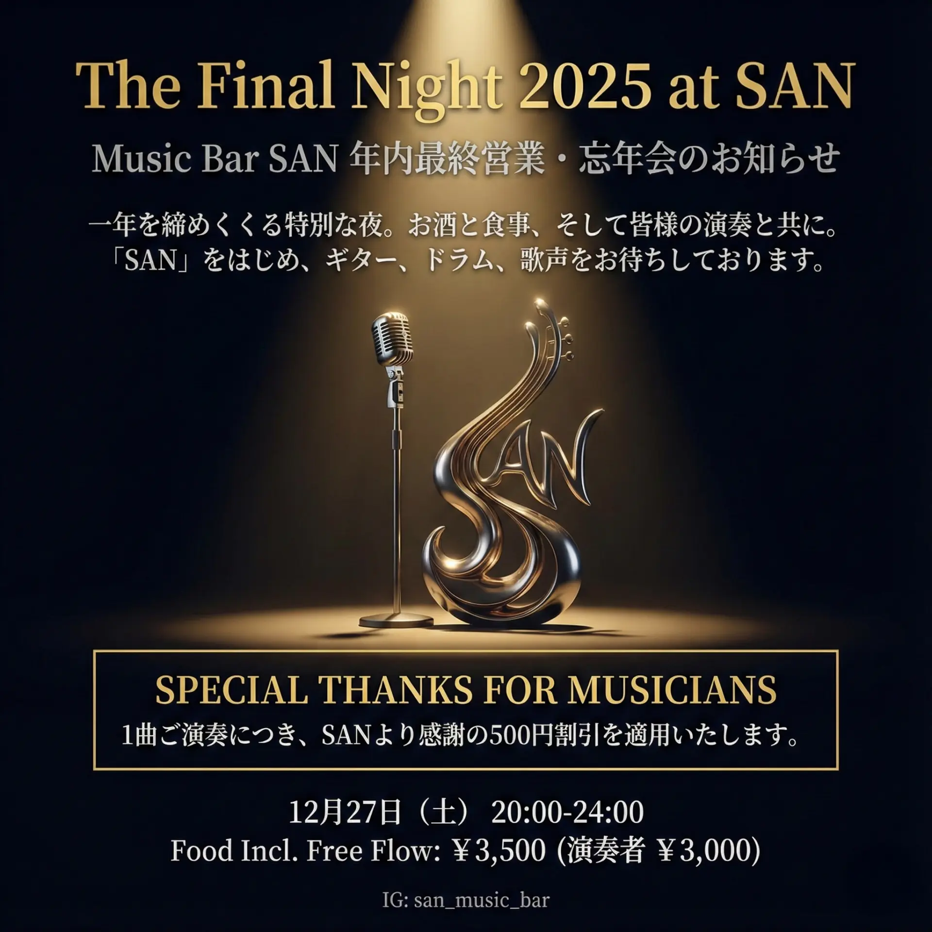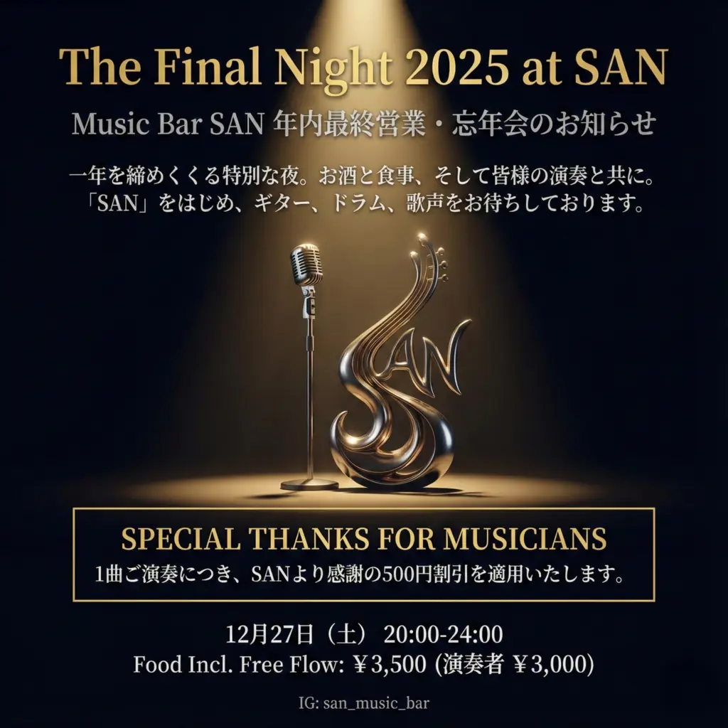 特典情報SPECIAL THANKS FOR MUSICIANSで1曲ご演奏につき、SANより感謝の500円割引を適用いたします!